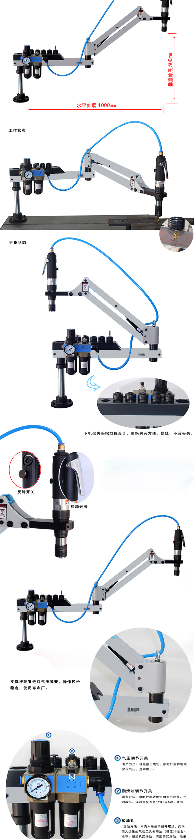 本機(jī)采用壓縮空氣驅(qū)動(dòng),安全快速高效;較小氣壓力和氣量(0.6-0.8mpa),超大扭力輸出;.能對(duì)各種鋼材、鐵、銅、鋁、塑料等材料攻絲;筒夾帶過載保護(hù)裝置,絲攻損傷較少,螺牙精度高;操作簡(jiǎn)單輕便,完全不需要經(jīng)驗(yàn)和技術(shù)。